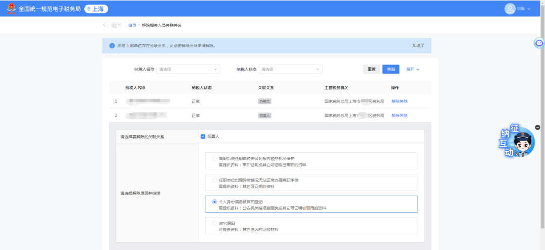 2.展示自然人关联的纳税人信息,点击【解除关联】。