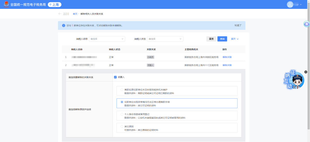 若是已离职的情况,点击选择解除原因“离职后原任职单位未及时报告税务机关维护 需提供资料:离职证明或其它可证明已离职的资料”。
