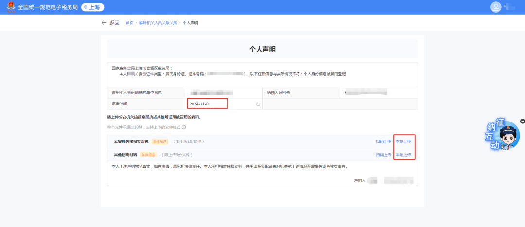 1)跳转个人声明界面,选择【报案时间】,点击【上传】上传对应资料。