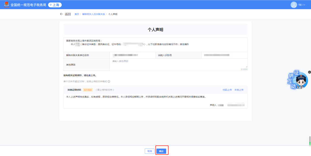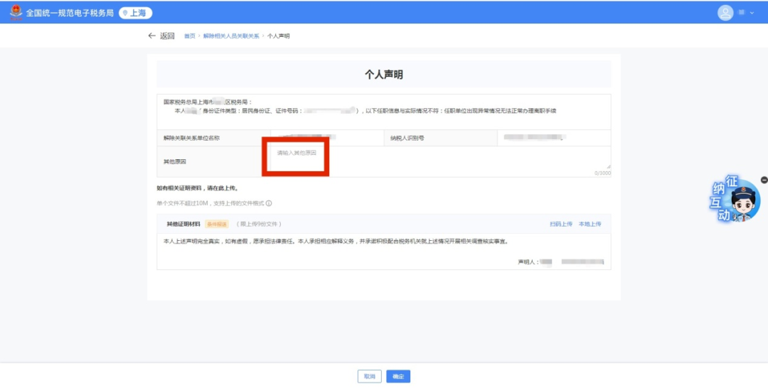 1)跳转个人声明界面,输入原因。点击【上传】上传其他证明资料。