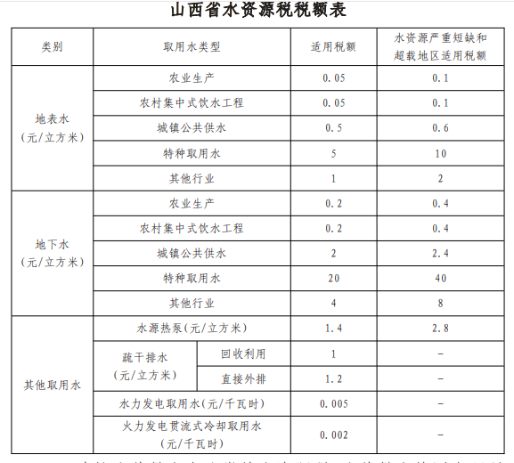 一、水资源税纳税人按照下表规定的适用税额计算缴纳水资源税。