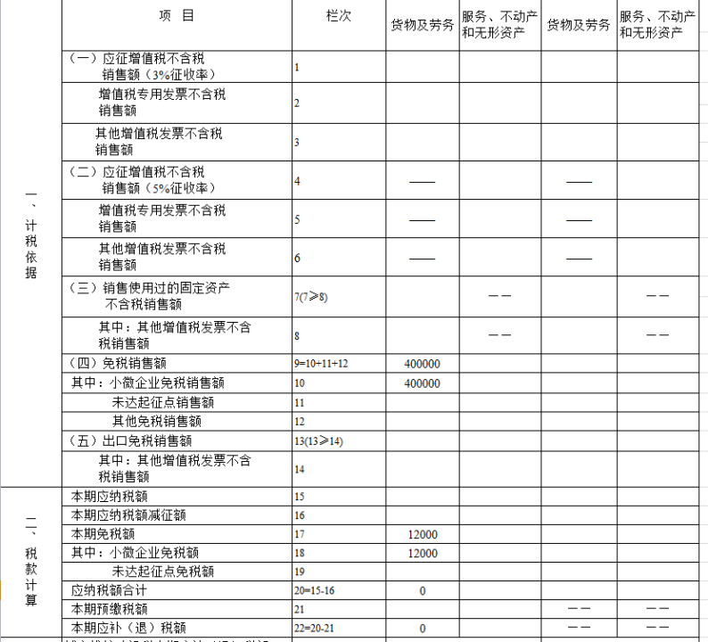 分析:纳税人季度销售额40万,未超过45万,按照国家税务总局公告2022年第6号的规定,增值税小规模纳税人发生增值税应税销售行为,合计月销售额未超过15万元(以1个季度为1个纳税期的,季度销售额未超过45万元,下同)的,免征增值税的销售额等项目应当填写在《增值税及附加税费申报表(小规模纳税人适用)》“小微企业免税销售额”或者“未达起征点销售额”相关栏次。