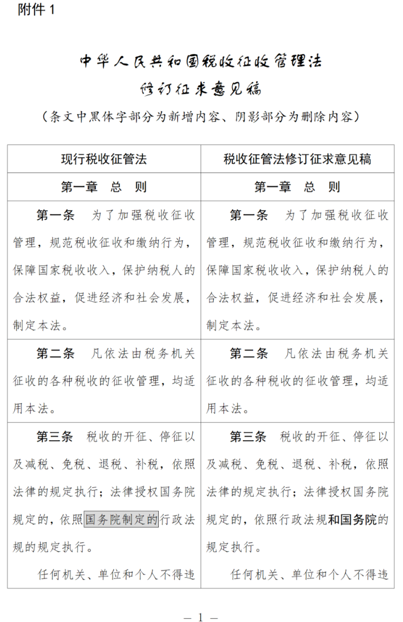 附件:1.《中华人民共和国税收征收管理法(修订征求意见稿)》对照表
