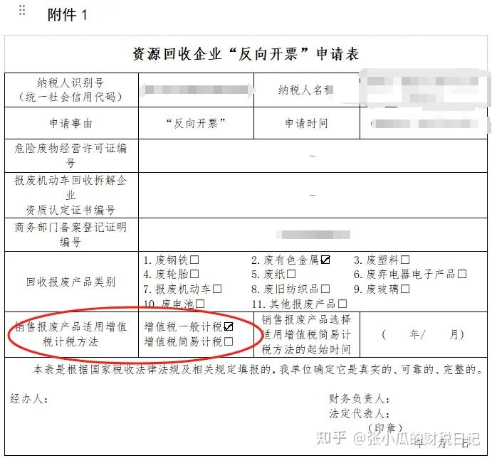 资源回收企业适用增值税一般计税还是简易计税,应在向税务部门提交的申请表(附件1)上进行勾选。