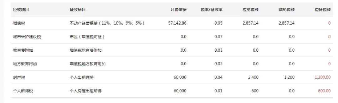假如出租个人住房取得年租金60000,开具专票发票的话,那么实际应该缴纳的税分别是: