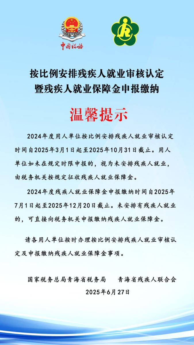 国家税务总局青海省税务局青海省残疾人联合会按比例安排残疾人就业审核认定暨残疾人就业保障金申报缴纳温馨提示