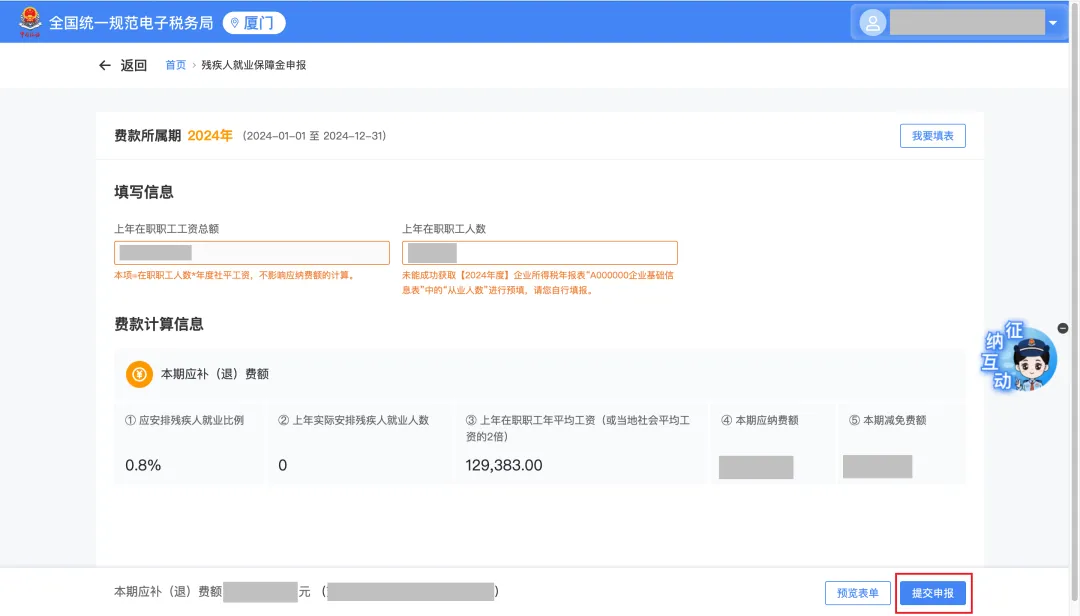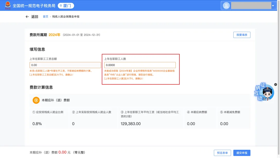进入申报前,系统弹窗提示2024年度企业实际安排残疾人就业人数,如对人数存在异议,请联系当地残联部门进行核实。