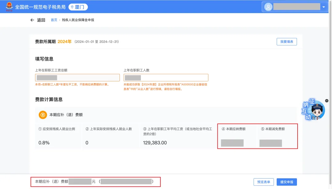 “上年在职职工人数”填写或确认完毕后,进一步确认“本期应纳费额”、“本期减免费额”以及“本期应补(退)费额”。