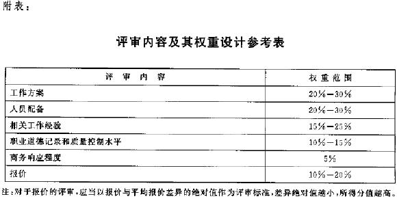 第十条 招标单位应当根据招标项目要求,综合考虑投标事务所的工作方案、人员配备、相关工作经验、职业道德记录和质量控制水平、商务响应程度、报价等方面,合理确定评审内容、设定评审标准、设计各项评审内容分值占总分值的权重。投标事务所报价分值的权重不应高于20%。