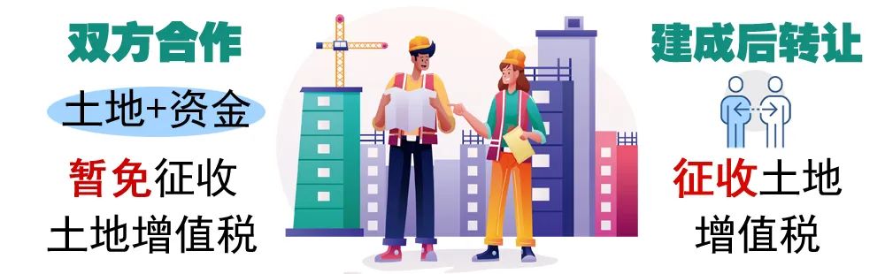 对于一方出地,一方出资金,双方合作建房,建成后按比例分房自用的,暂免征收土地增值税;建成后转让的,应征收土地增值税。