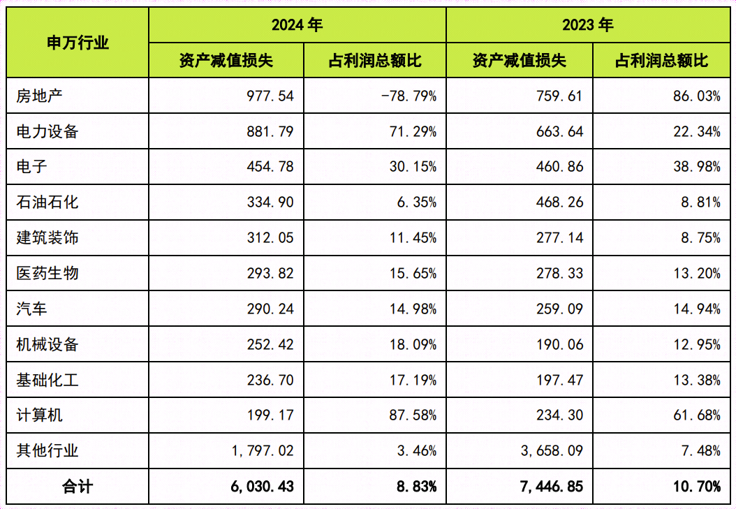 房地产行业主要受房价持续下跌、市场长期疲软、历史高地价项目结转等影响,大面积计提存货跌价损失;电力设备行业主要受产业链价格战、原材料价格波动、技术迭代加速、资产老化等影响大量计提存货跌价损失、固定资产减值损失。