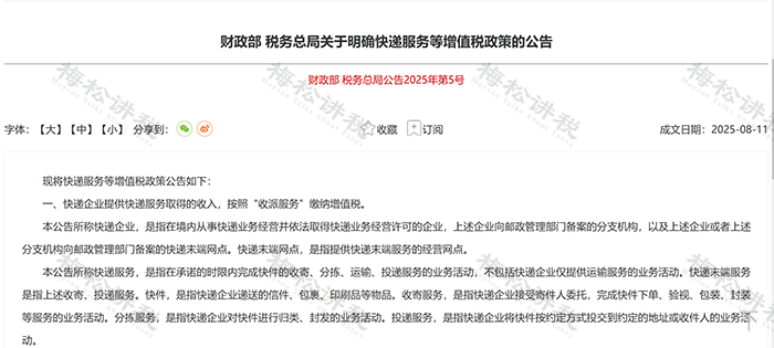8月12日,财政部 税务总局发布《关于明确快递服务等增值税政策的公告》。