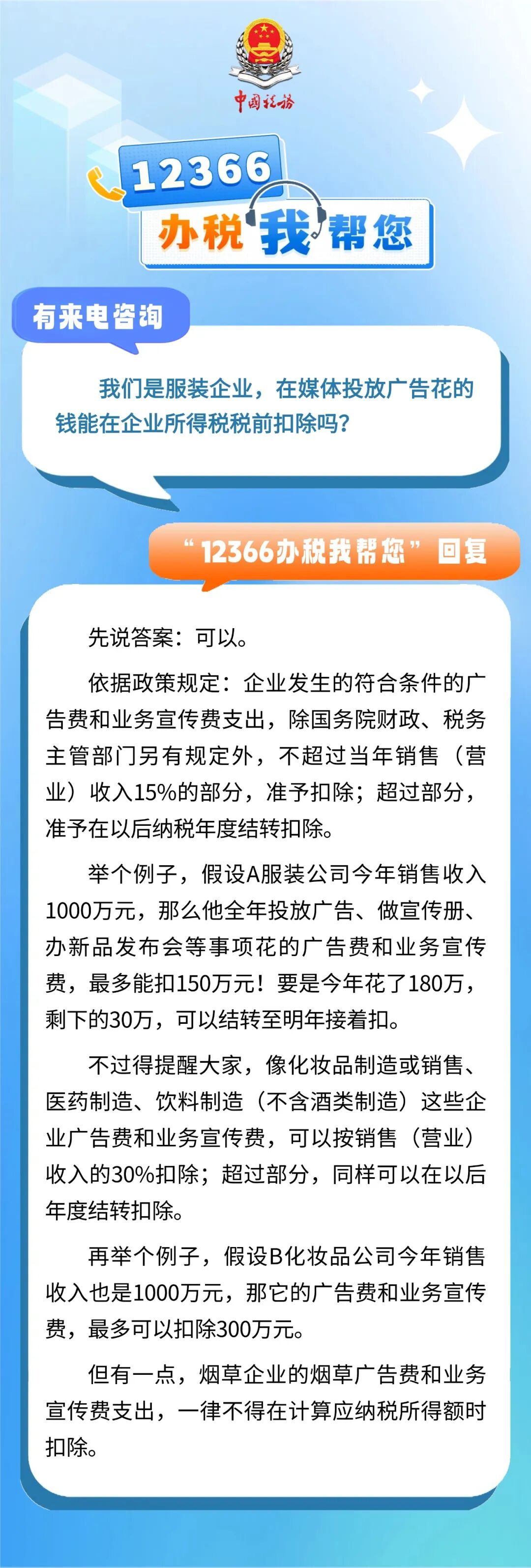 有来电咨询 :我们是服装企业,在媒体投放广告花的钱能在企业所得税税前扣除吗?一起来看看回复吧↓