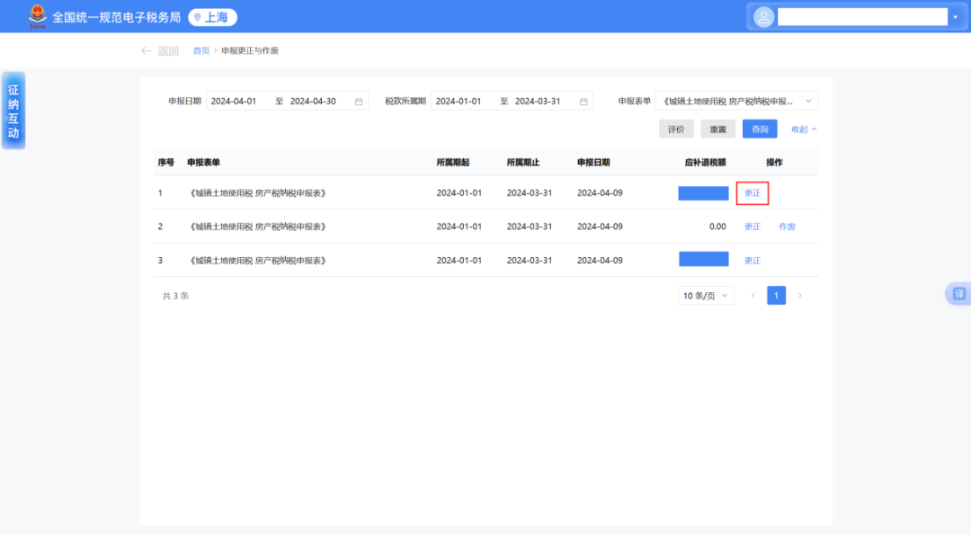 点击需修改的房产税税款对应后方的“更正”按钮。进入房产税税源维护主页。(提示:请确保跳转后页面显示的标签为“房产税税源管理”,如显示为“城镇土地使用税税源管理”,需返回后重新选择房产税对应的税款)