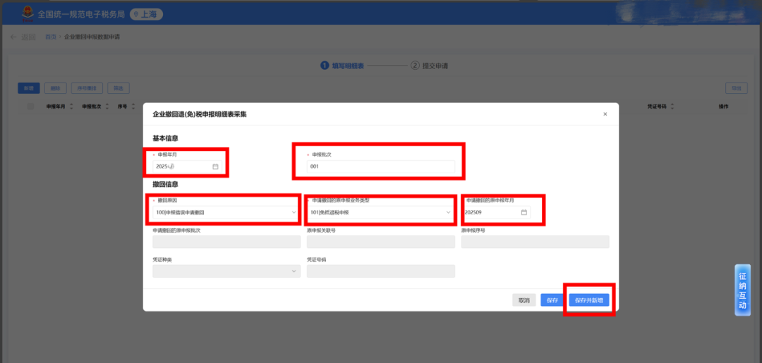 点击页面上的 “新增” 按钮,会弹出《企业撤回退(免)税申报明细表》采集界面。如申报错误则“撤回原因”选择“申报错误申请撤回”,再如实录入申请撤回的原申报业务类型、所属期、原申报批次等信息,填完后点击 “保存并新增”。