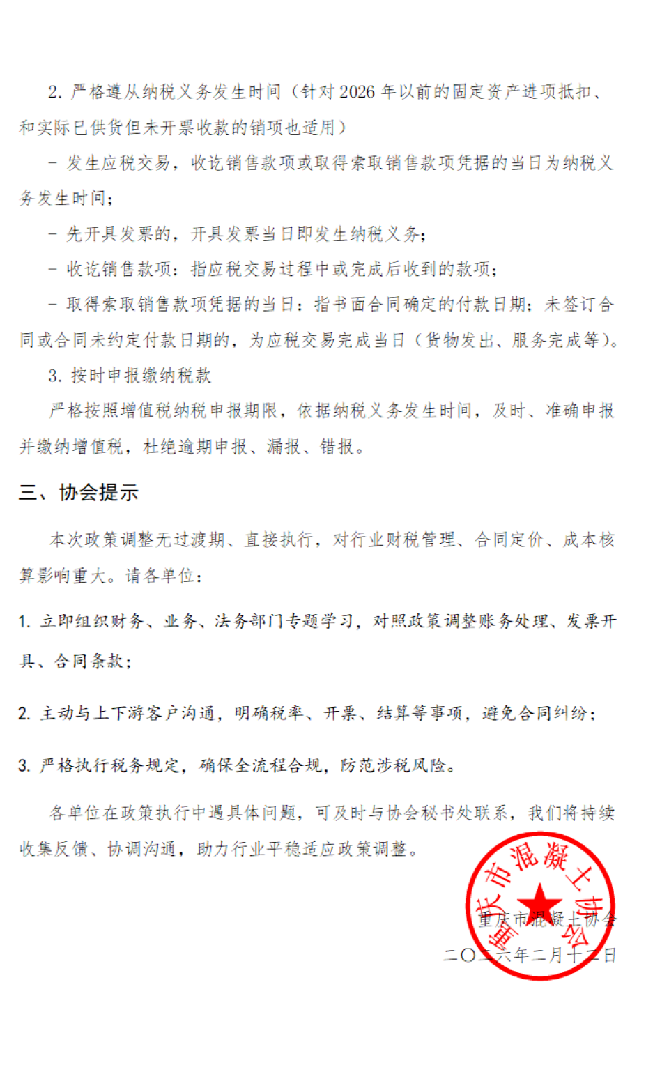 近日,重庆市税务部门就2026年1月1日起施行的《中华人民共和国增值税法》及配套政策,与我会进行专项沟通,明确了商品混凝土增值税计税方法的调整。为保障各单位合规经营、准确申报纳税,现将政策调整与执行要求正式通知如下: