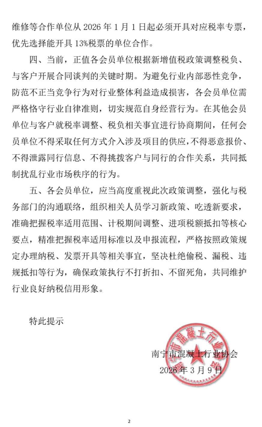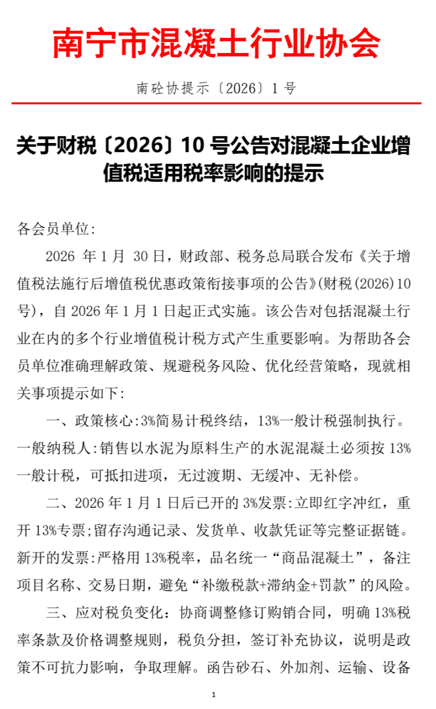 关于财税〔2026〕10号公告对混凝土企业增值税适用税率影响的提示