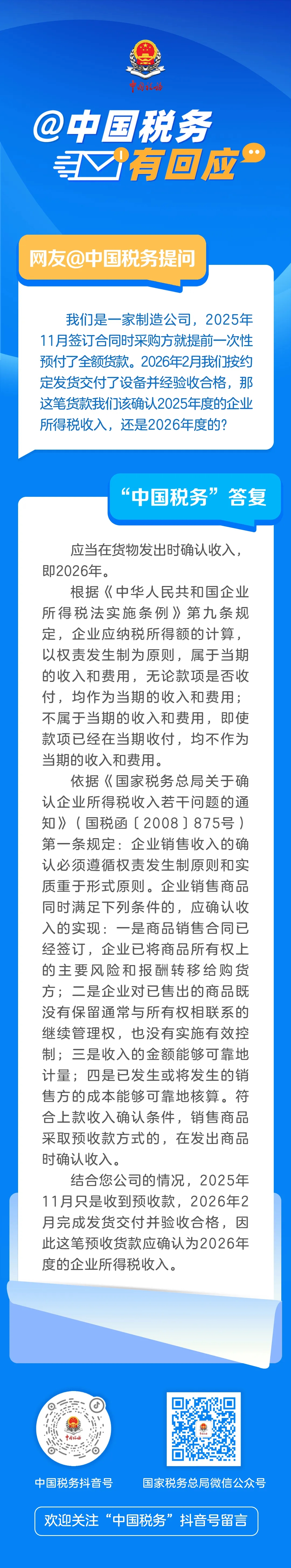 2025年11月签订合同并付款,2026年2月发货,企业所得税收入如何确认?