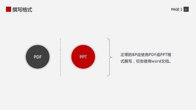 项目BP采用PDF或PPT格式,千万别用wrod文本,我们都不愿意打开。如果是参加创业大赛的路演,记住!!! 把PPT转成PDF,别让花哨的动画效果浪费有限的路演时间,投资人也从不在意你的动画效果。