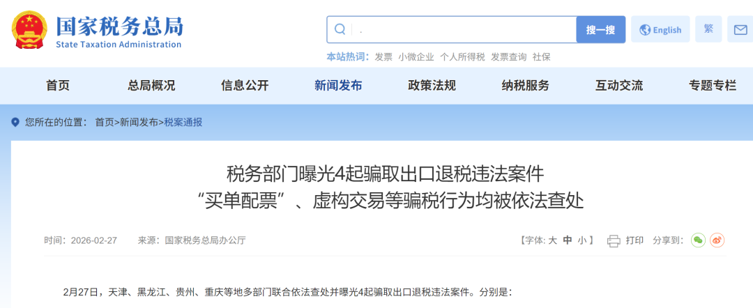 2月27日,天津、黑龙江、贵州、重庆等地多部门联合依法查处并曝光4起骗取出口退税违法案件。分别是: