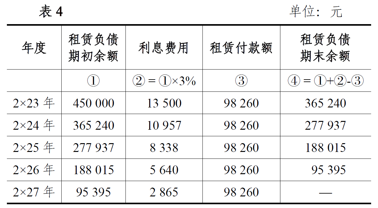 各期租赁付款额=450 000/(P/A, 3%, 5)=98 260(元)