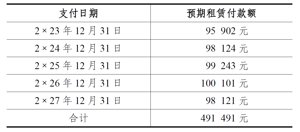 未确认融资费用= 5 年租赁付款额-5 年租赁付款额的现值=491 300450 00041 300(元)