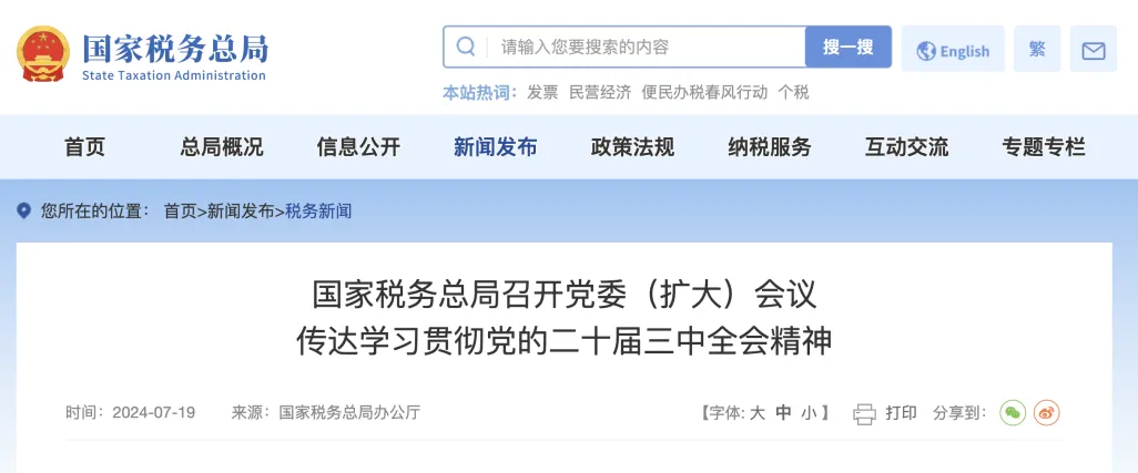 同日,国家税务总局党委书记、局长胡静林主持召开党委(扩大)会议,传达学习党的二十届三中全会精神,研究部署税务系统贯彻落实措施。会议要求,要强化“一把手”负总责、班子成员分工负责、层层督进、环环紧扣的抓落实工作机制,逐项细化制定改革落实的任务书、路线图、时间表,确保把责任压实到岗、明确到人、具体到事。要着眼大局顺应大势,把握好方式方法,统筹好收与支、税与费、增与减、稳与进,着力营造良好改革氛围,确保各项涉税改革任务不折不扣落地见效。