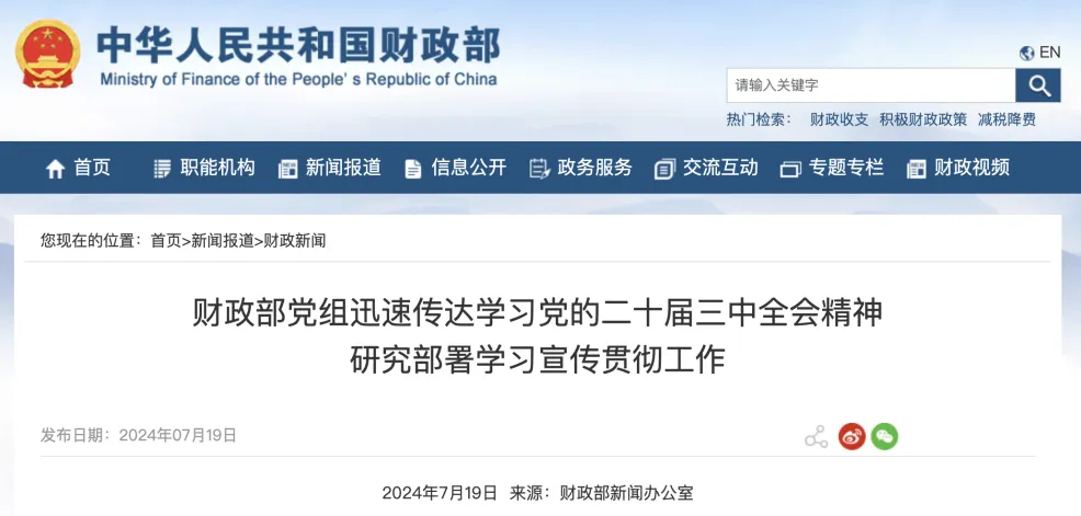 7月19日上午,财政部党组召开专题会议,传达学习党的二十届三中全会精神,研究部署财政部学习宣传贯彻工作。财政部党组书记、部长蓝佛安主持会议并讲话。会议强调,深化财税体制改革,建立健全与中国式现代化相适应的财政制度,为更好发挥财政职能作用提供坚实制度保障。要坚持不懈以钉钉子精神抓改革落实,进一步增强责任感和使命感,当好改革促进派、实干家,建立健全涵盖改革方案研究、制订、出台、落实、评估等各环节的闭环管理工作机制,构建上下协同、条块结合、精准高效的改革工作格局,确保改到位、抓到底。