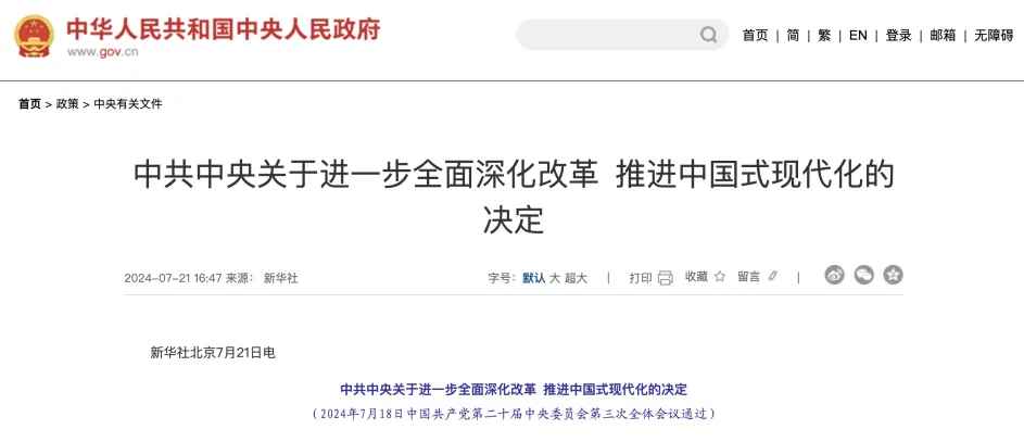 7月18日,党的二十届三中全会审议通过《中共中央关于进一步全面深化改革、推进中国式现代化的决定》,《决定》共提出300多项重要改革举措,并提出到二〇二九年中华人民共和国成立八十周年时,完成本决定提出的改革任务。