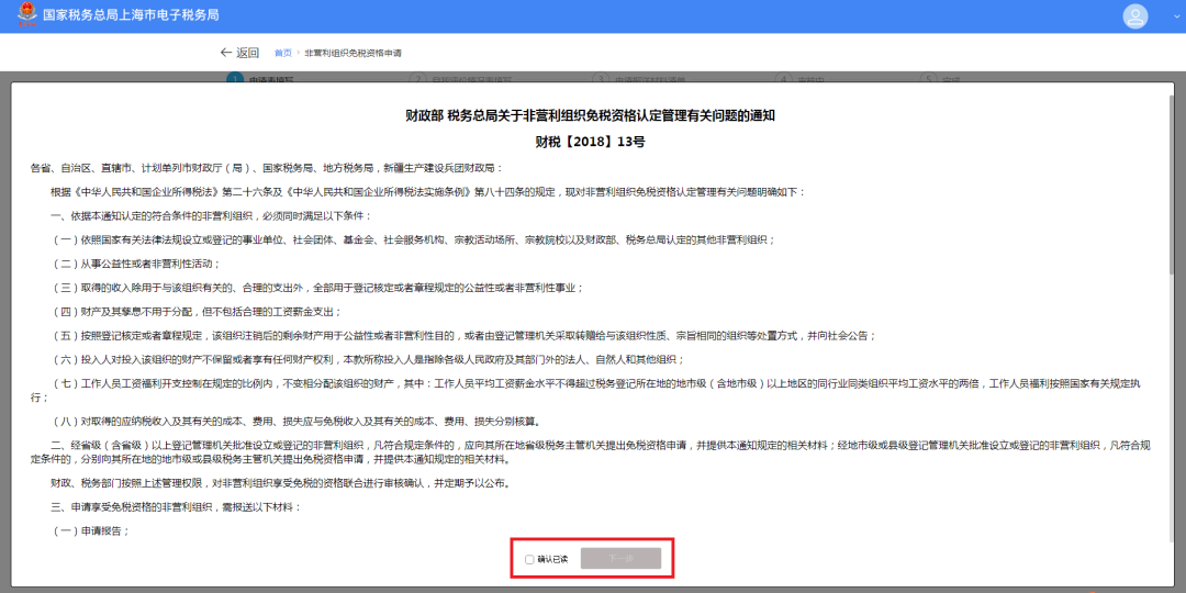 在浏览办理须知后,系统会自动对组织是否已获取非营利组织免税资格进行校验。