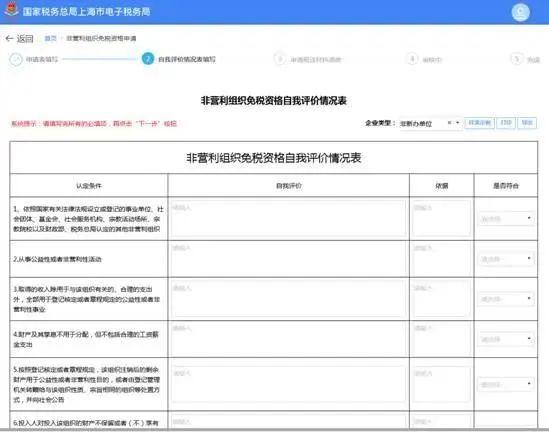 填写页面上的信息,其中“*”标明的数据项为必填信息,填写完整后,点击“下一步”,进入非营利组织免税资格自我评价情况表页面。