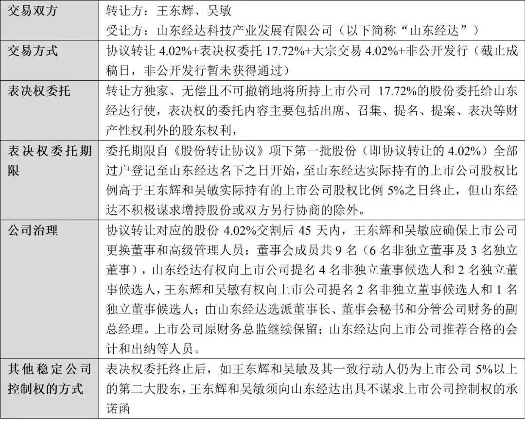 山东经达收购荣联科技的初始交易方案为表决权委托+协议转让+非公开发行,2021年交易所修订了协议转让业务办理规则,“与上市公司收购相关的协议转让”不再构成协议转让股份比例需达到5%以上的例外情况。因此,荣联科技对原定第二笔4.02%的协议转让安排进行了调整,同时由于转让方系大股东,通过大宗交易减持需要遵守连续90个自然日不超过2%的规定,遂最终通过多次大宗交易完成了对应股份的转让: