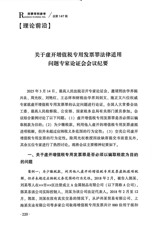 编者按:近日,由最高人民法院刑事审判第四庭编写的《刑事审判参考(惩处危害税收征管犯罪专辑)》已在人民法院出版社出版发行。本书收录了最高人民法院于2025年3月14日组织召开的关于虚开增值税专用发票罪法律适用问题专家论证会的会议纪要,对于从学理上正确理解两高涉税司法解释条款具有重要参考价值和指导意义。现将该部分内容选摘如下: