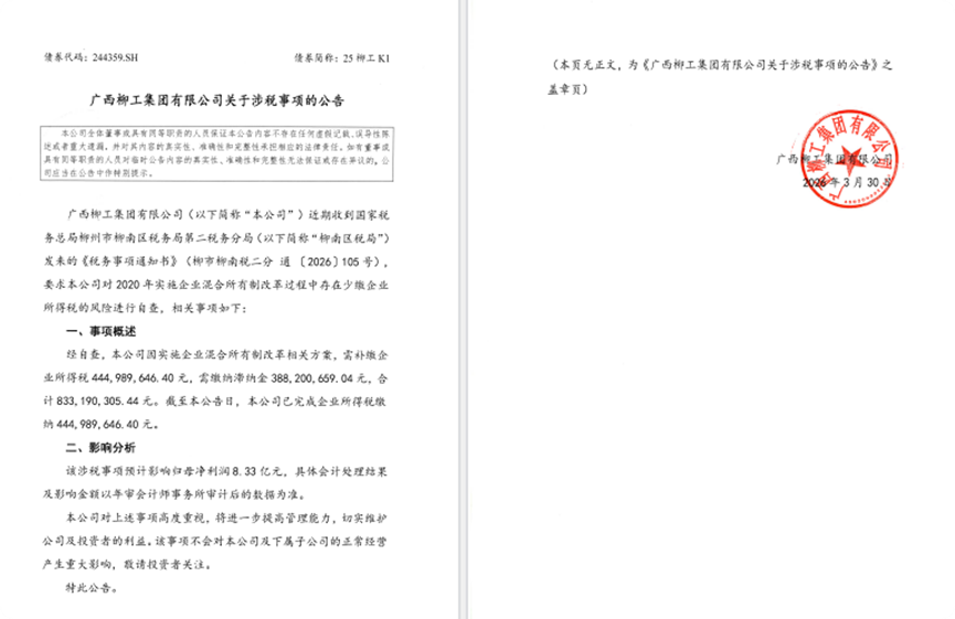 近期,广西柳工集团有限公司(以下简称“公司”)公告披露收到国家税务总局柳州市柳南区税务局第二税务分局(以下简称“柳南区税局”)发来的《税务事项通知书》(柳市柳南税二分通〔2026〕105号),要求公司对 2020 年实施企业混合所有制改革过程中存在少缴企业所得税的风险进行自查。