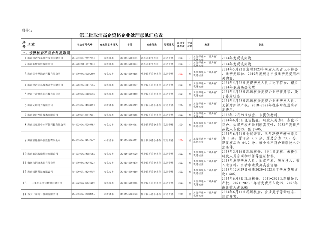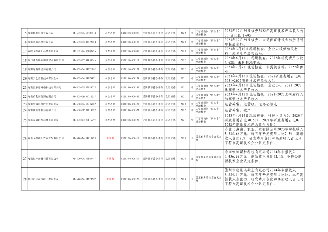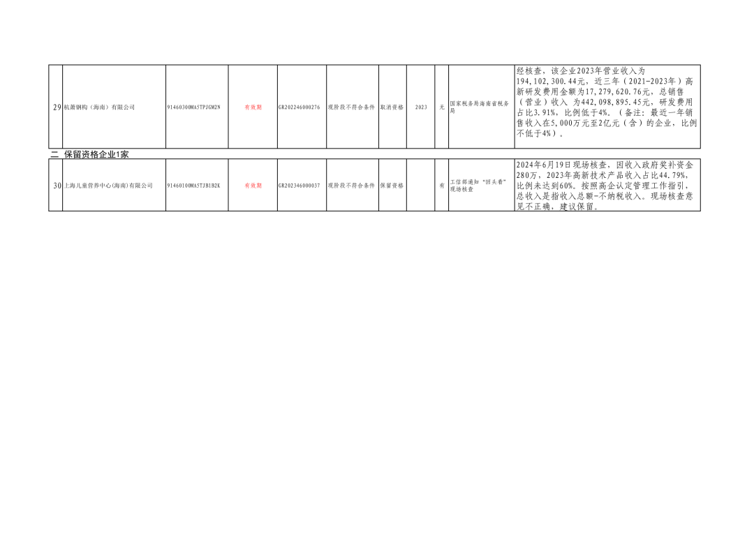 30家企业只有一家(上海儿童营养中心(海南)有限公司)保留资格,其余29家全部取消高企资格。保留的原因是:2024年6月19日现场核查,因收入政府奖补资金280万,2023年高新技术产品收入占比44.79%,比例未达到60%。按照